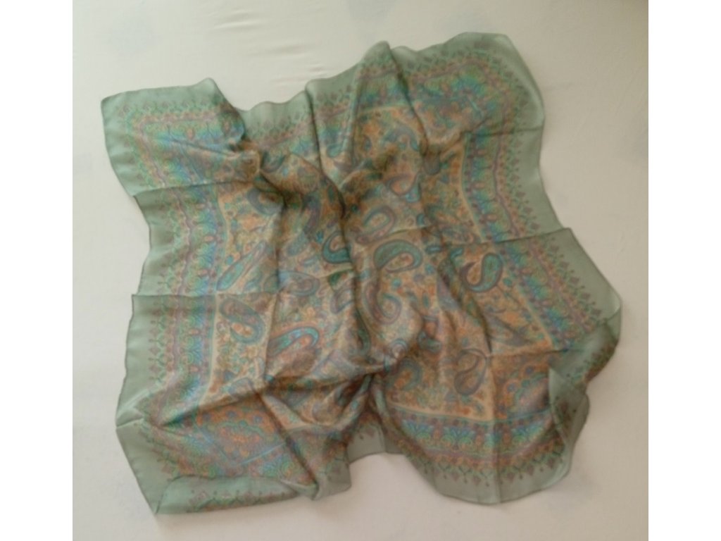 Zelenkavý čtvercový hedvábný šátek. 100% hedvábí. Rozměry 95 x 95 cm. Vhodný do kabátu, nebo i jako doplněk ke společenským šatům. Na běžné nošení i na slavnostní chvíle. Velmi tenký, příjemný na dotek, v létě chladí v zimě hřeje. Více o hedvábí se dočtete u nás na blogu.