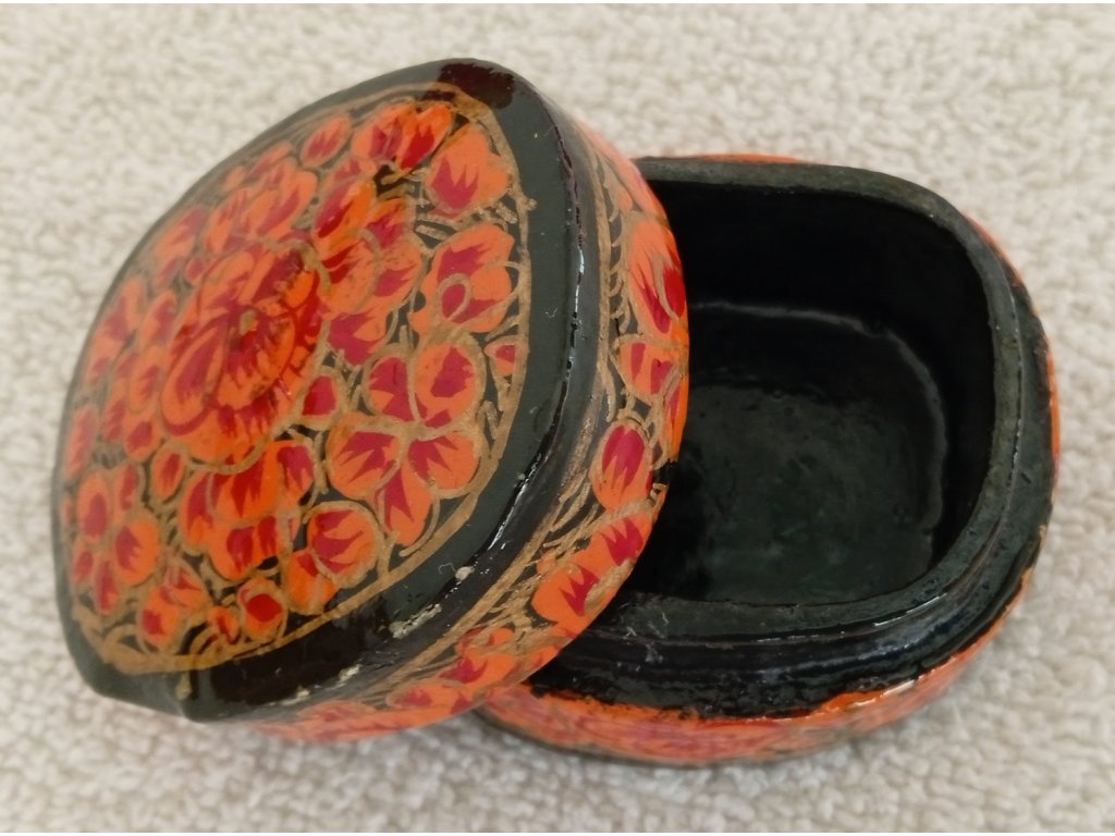 Dárková krabička. Rozměry 3  x 5  x 6  cm. Výrobek z kašírovaného papíru ( více informací o kašírovaném papíru si můžete přečíst na našem blogu). Materiál je pevný, odolný a krátkodobě i voděodolný. Připomíná dřevo. Ruční výroba i malování.