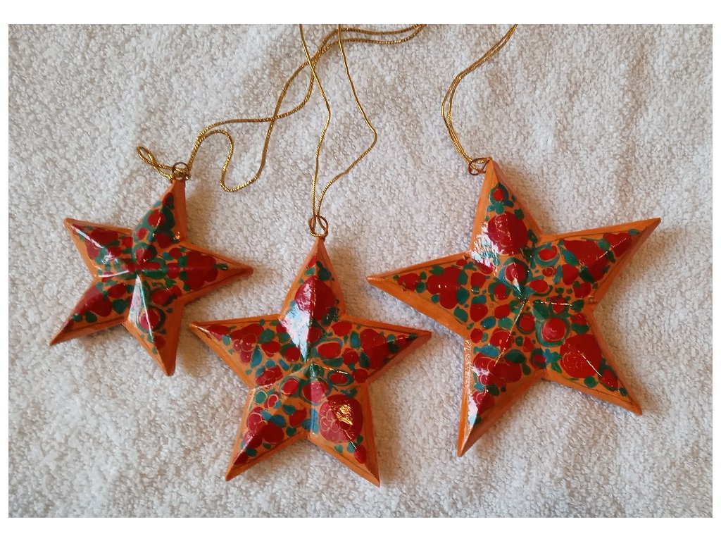 Set 3 hvězdiček různých velikostí. Velmi pěkné a netradiční ozdoby na vánoční stromeček. Rozměry:  největší 13 cm, menší 11 cm a nejmenší 9 cm. Hvězdičky jsou vyrobeny z kašírovaného papíru ( více informací o kašírovaném papíru si můžete přečíst na našem blogu). Materiál je pevný a krátkodobě i voděodolný, připomíná dřevo. Vše je ručně vyrobeno a malováno. Takže i když se jedná o set, vzory se mohou nepatrně lišit.