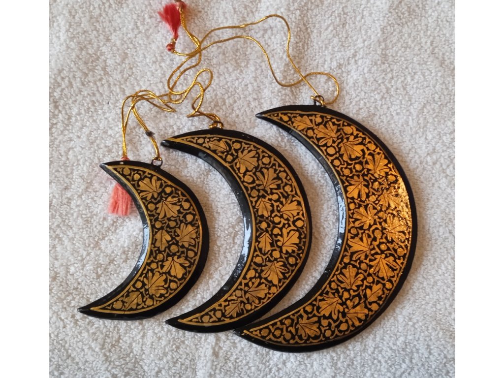 Set 3 měsíčků různých velikostí. Velmi pěkné a netradiční ozdoby na vánoční stromeček. Rozměry:  největší 13 cm, menší 10 cm a nejmenší 8 cm. Měsíce jsou vyrobeny z kašírovaného papíru ( více informací o kašírovaném papíru si můžete přečíst na našem blogu). Materiál je pevný a krátkodobě i voděodolný, připomíná dřevo. Vše je ručně vyrobeno a malováno. Takže i když se jedná o set, vzory se mohou nepatrně lišit.