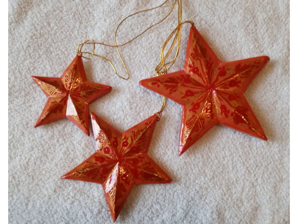 Set 3 hvězdiček různých velikostí. Velmi pěkné a netradiční ozdoby na vánoční stromeček. Rozměry: největší 13 cm, menší 11 cm a nejmenší 9 cm. Hvězdičky jsou vyrobeny z kašírovaného papíru ( více informací o kašírovaném papíru si můžete přečíst na našem blogu). Materiál je pevný a krátkodobě i voděodolný, připomíná dřevo. Vše je ručně vyrobeno a malováno. Takže i když se jedná o set, vzory se mohou nepatrně lišit.