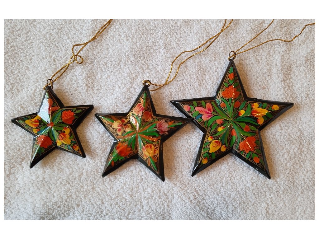 Set 3 hvězdiček různých velikostí. Velmi pěkné a netradiční ozdoby na vánoční stromeček. Rozměry:  největší 13 cm, menší 11 cm a nejmenší 9 cm. Hvězdičky jsou vyrobeny z kašírovaného papíru ( více informací o kašírovaném papíru si můžete přečíst na našem blogu). Materiál je pevný a krátkodobě i voděodolný, připomíná dřevo. Vše je ručně vyrobeno a malováno. Takže i když se jedná o set, vzory se mohou nepatrně lišit.