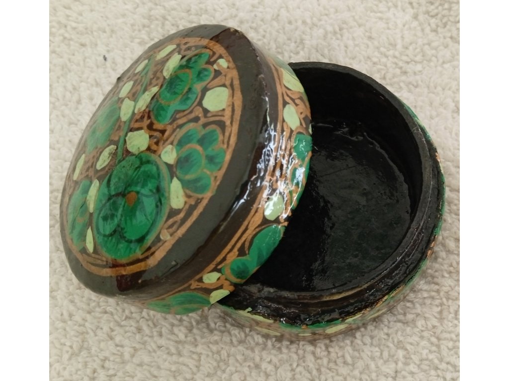 Krabička kulatého tvaru. Průměr: 5,5,cm. Výrobek z kašírovaného papíru ( více informací o kašírovaném papíru si můžete přečíst na našem blogu). Materiál je pevný, odolný a krátkodobě i voděodolný. Připomíná dřevo. Ruční výroba i malování.